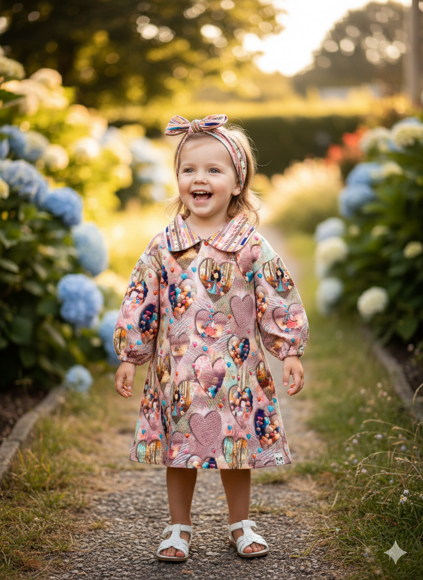 Unikátne šatičky v retro štýle dopĺňajú doplnky čelenka a scrunchie, vo vzore límca na šatičkách. Radosť z nosenia zaručí príjemný materiál a pohodlný strih. Materiál je kvalitná teplákovina s digitálnou potlačou.