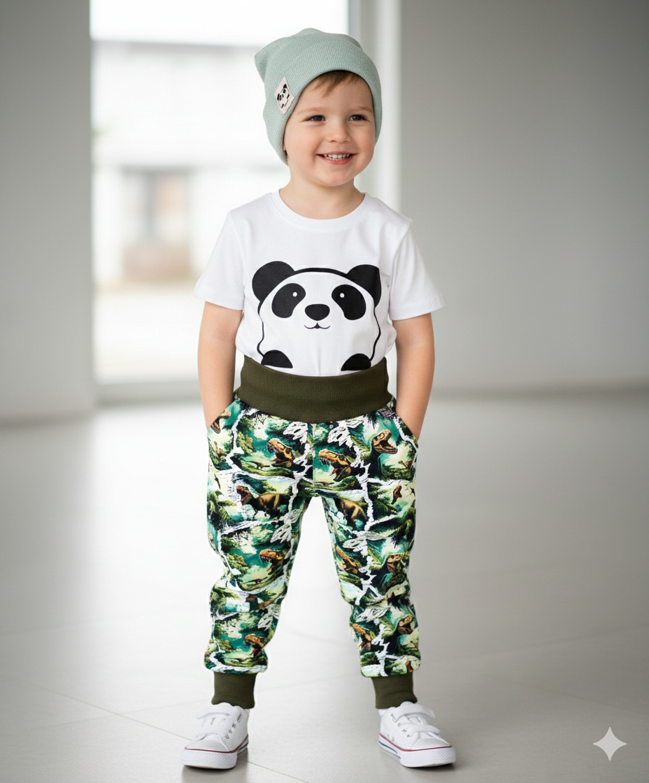 Parádne zimné softshellové nohavice pre milovníkov dinosaurov. V klasickom strihu, s jedným vačkom na boku, predlžujúce spodné patenty a s vyvýšeným chrbátikom na kríže. Strih je veľmi pohodlný. Pre inú veľkosť, nám kľudne napíšte mail, šijeme aj na objednávku.